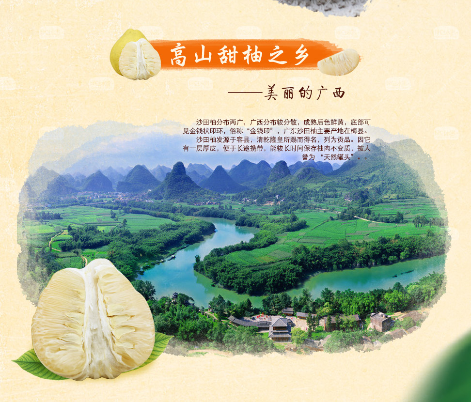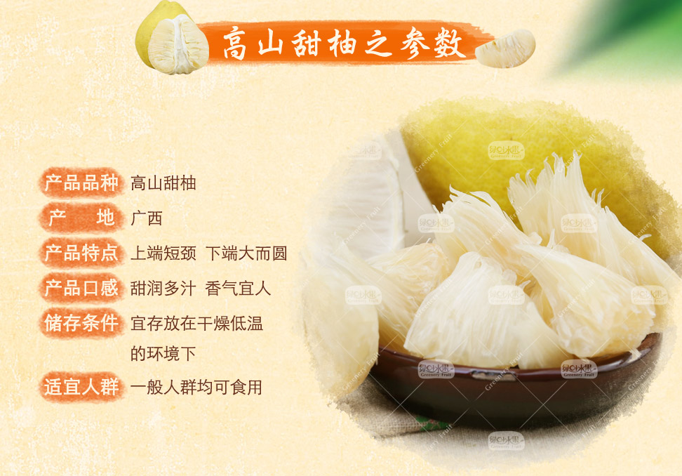 海拔600米以上的玉林地区、高山种植。无污染、纯天然、属沙田柚极品!上端短颈,下端大而圆,柚皮油黄,口感细腻,肉质脆嫩,入口化渣,香甜多汁,营养丰富,柚香怡人!糖尿病人的优选之品!