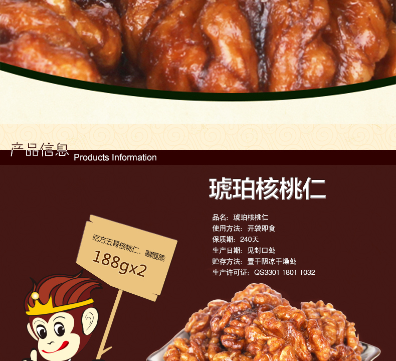 坚果休闲零食特产琥珀核桃仁188gX3罐